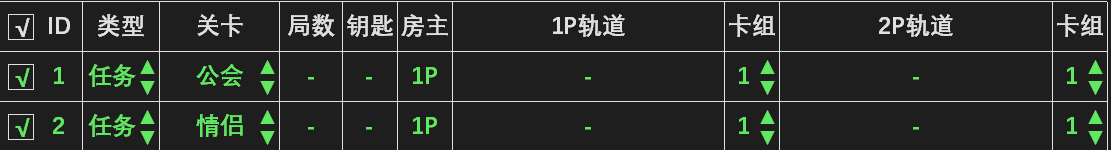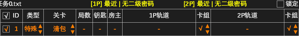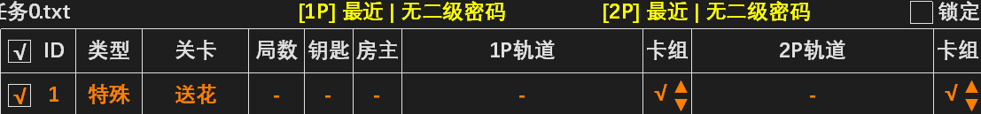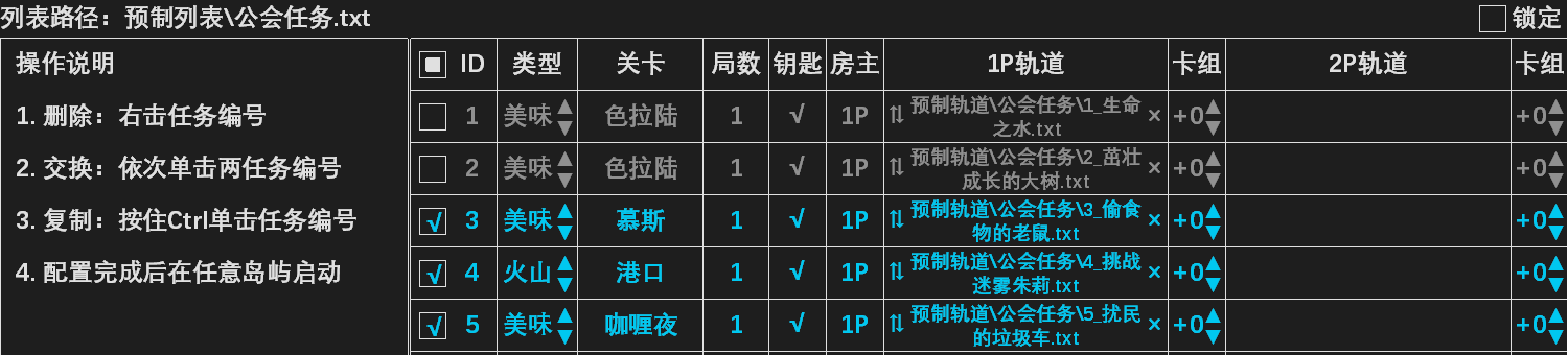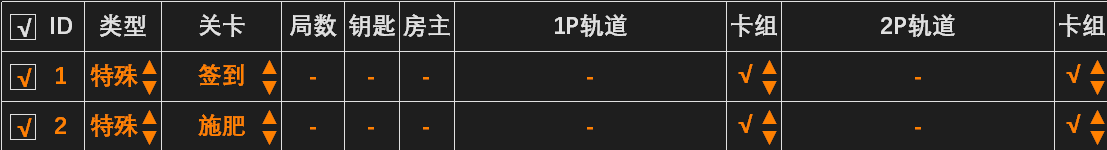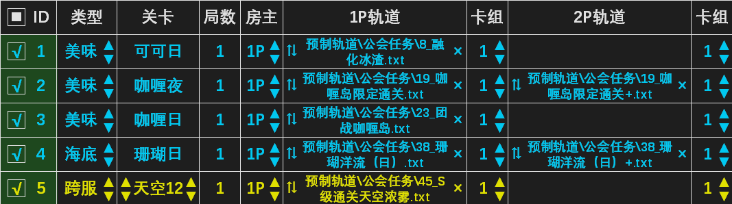 - 只有勾选的任务才会执行。例如你的配置不足以通关音乐节夜,则可取消勾选此任务。其中4个任务(冰跨12,冰跨13,多拿滋,10损巴旦夜)暂无平民轨道,默认不勾选,若玩家配置足够,可自制轨道后勾选。