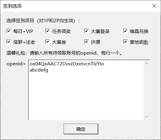 - 卡组“√”“×”表示该账号是否执行。“施肥”包含浇水和施肥。签到包含8项签到和温馨礼包,点击1P轨道即可设置(左图)。其中暗晶兑换需要二级密码(如果有),请点击执行器顶部“无二级密码”进行填写。领取温馨礼包需要填写openid:进入微信服务号“美食大战老鼠”,打开“美食中心”(右图),点击右上角“...”,选择“复制链接”,将链接中“openid=”后面的字母填入温馨礼包输入框即可(左图)。