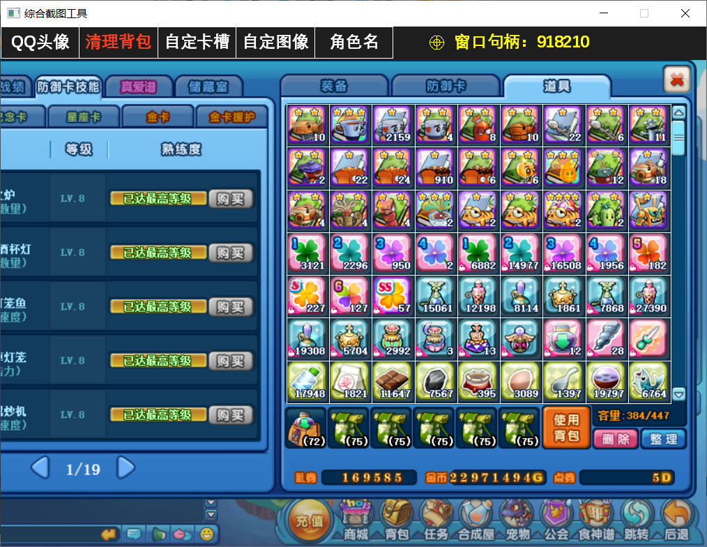 - 在用户参数\清理背包文件夹内有截图的物品才会删除、分解或使用。运行用户参数\综合截图工具.exe,选择清理背包选项卡(如左下图),将右上角靶子拖动至道具背包截图需删除的物品,拖动至装备背包截图需分解的宝石和需使用的消耗品(金币、威望等)。