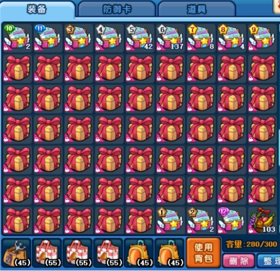 - 截图了一种物品就会使用所有图像相同的物品,如有不希望使用的物品请放入储藏室。特例:截图普通礼包时,只会使用整理后位于3-11星卡包后面的礼包(如右上图),主要包括十三香礼包、米苏的回礼和星座卡初级技能书箱,不会使用各种转职套餐。但用户至少要保留一个3-11星卡包用于定位,否则不会使用任何普通礼包。