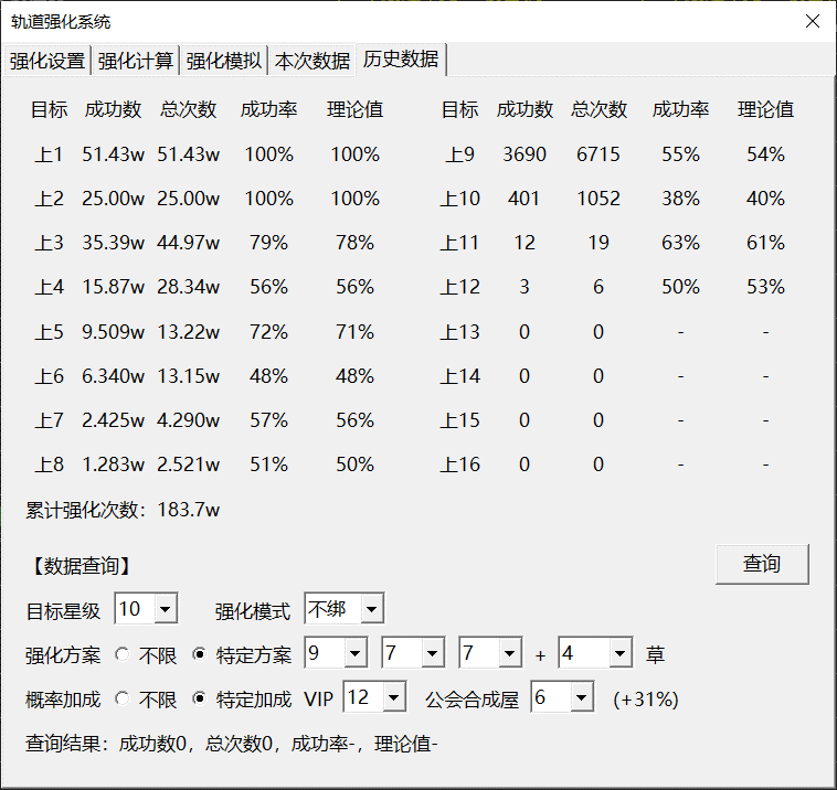 - 历史数据统计历史所有强化任务的结果。数据较大时可以验证理论成功率的真实性。若同一星级使用过多种强化方案,结果将被合并。可以在下方的“数据查询”模块查询单一强化方案的统计结果。