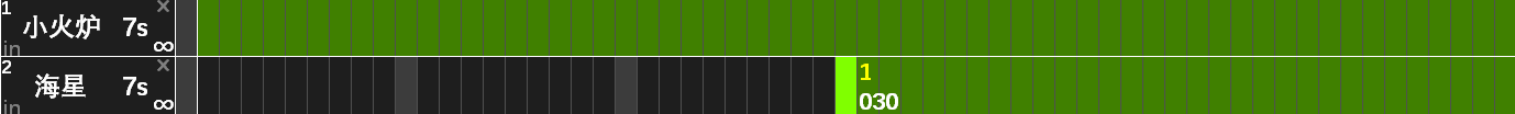 - 轨道编辑界面主要由时间轴、轨道区组成。“轨道”在图中以蓝色长条表示,例如小火炉轨道