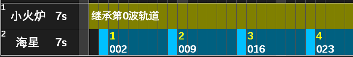 - 如果希望某些卡到达新波次后继续执行原波次的轨道,只需单击卡槽左上角的编号启用轨道继承。例如第 4 波轨道按下图设置时,小火进入第 4 波后继续执行第 0 波轨道,而海星则执行第 4 波轨道。