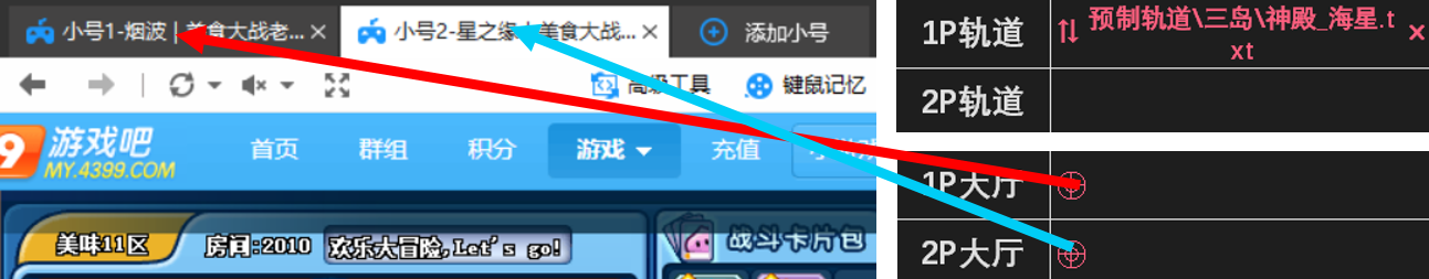 - 打开后能看到两个人物位置的轨道是双人轨道,例如神殿_海星.txt(左图)。将双人轨道拖入1P轨道,然后分别抓取1P和2P大厅(右图),即可由1P带2P刷图。