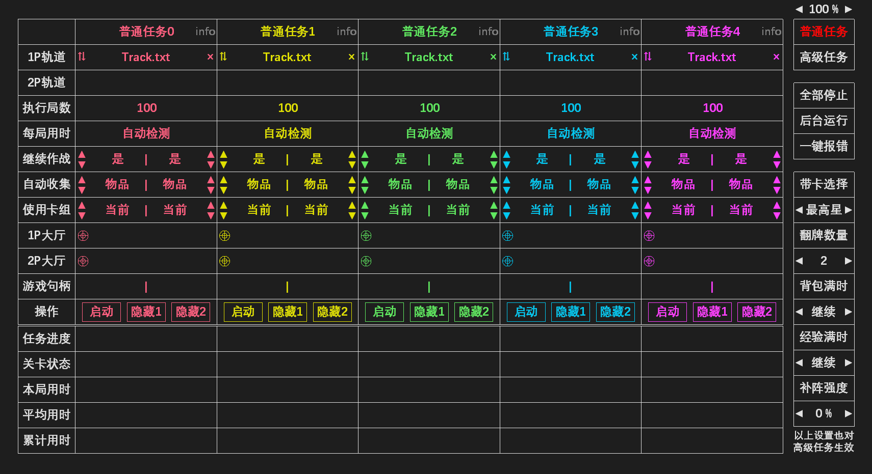 - 普通任务界面如下图所示,5 个任务栏位可以同时执行 5 组刷图。如何使用预制轨道刷图已在第 1 章简要介绍,本节将对各项参数的设置和注意事项进行补充。