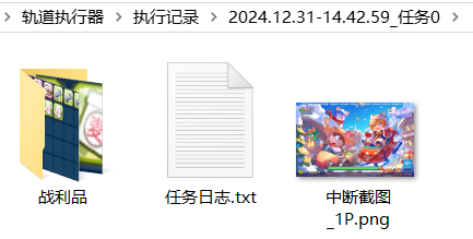 - 每次启动任务后会在执行记录目录下生成一个日志文件夹,保存本次任务的战利品、任务日志、中断截图等信息: